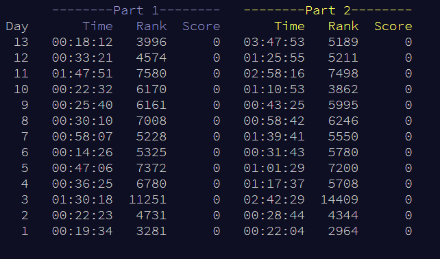 Today’s problem looked inoffensive, and to be fair, it was for the first part. Despite the volatile state of my mind, I managed to craft fairly quickly a solution which passed the example test. All in eighteen minutes and twelve seconds, my fastest part one time since day 6.