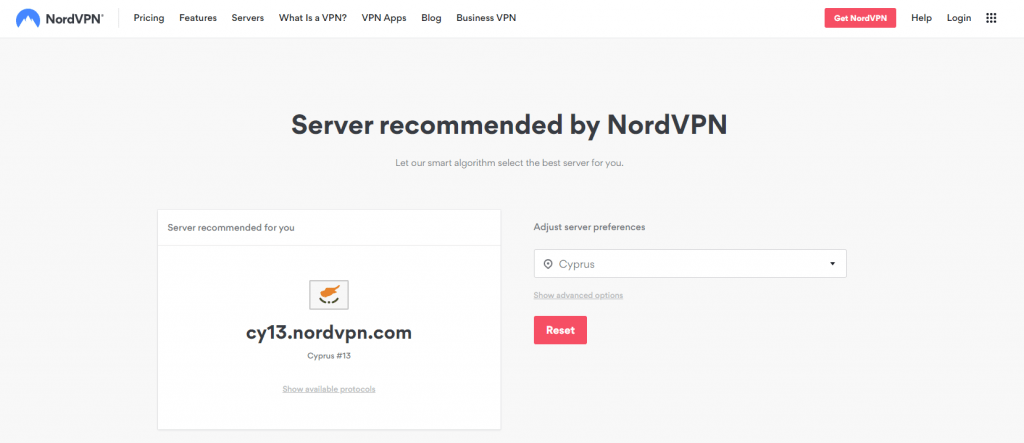 We can do just that by going to the NordVPN tools page. It will show you the country you’re in with the recommended server to be as close to your current performance levels as possible. You can change that to another country and pick the server you like based on the features it offers and such. For this example, I chose to get a Cyprus server as you can see below: